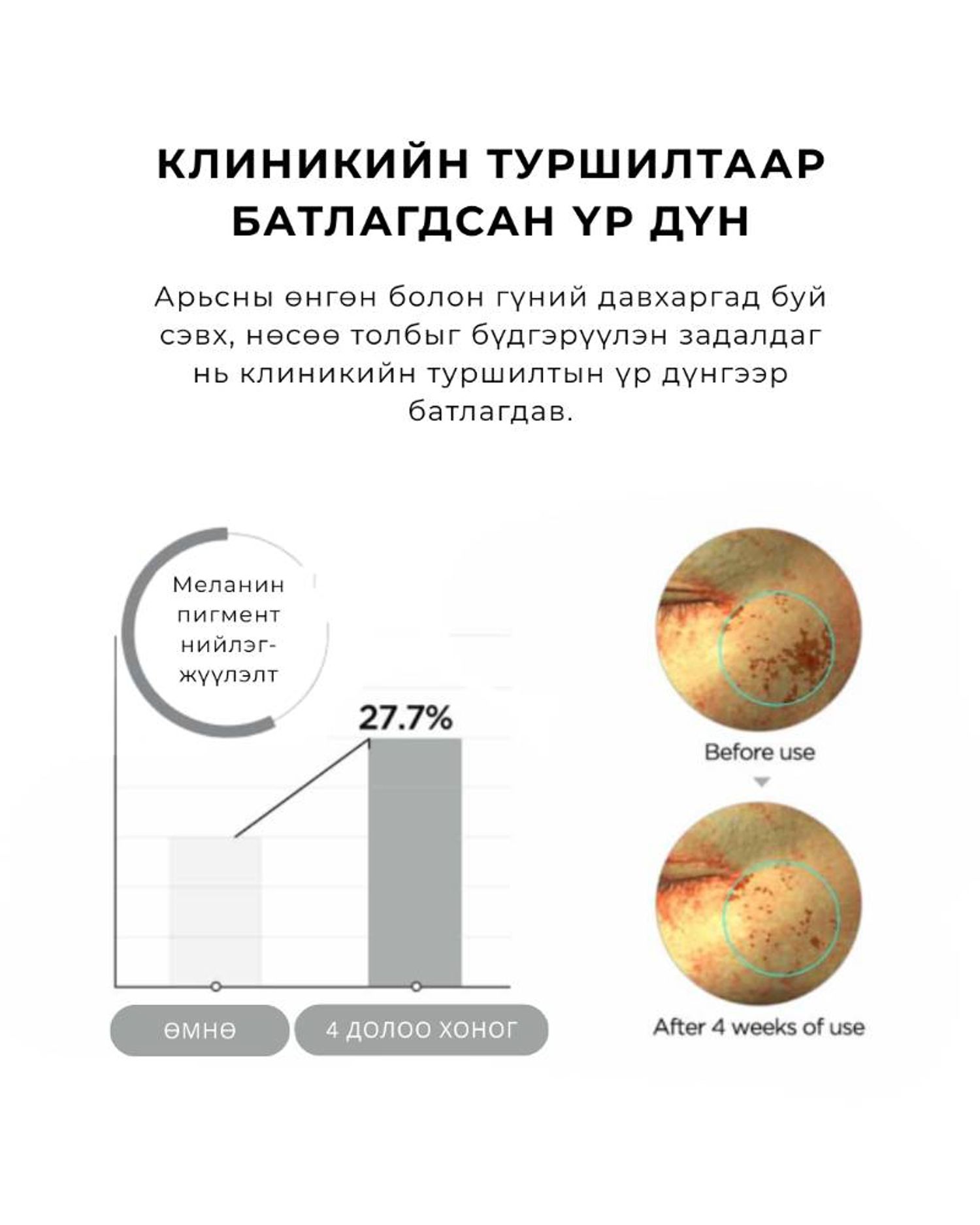 -MadeWhite™ болон Кожийн хүчил нь гадаргуугийн болон арьсны гүний нөсөө толбыг задалж, өөгүй цэвэрхэн арьсыг цогцлооход тусална.