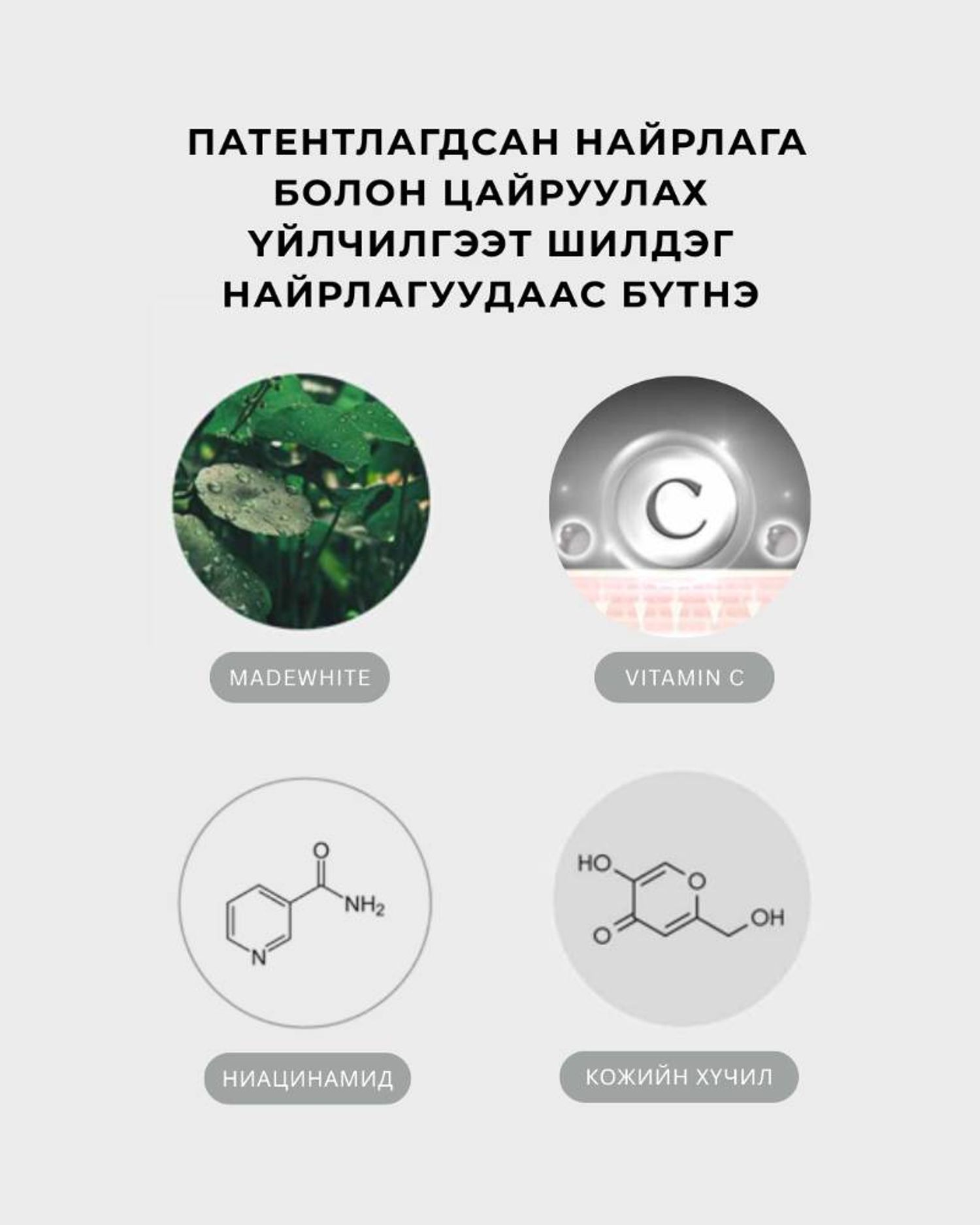 Центелла Азиатика, MadeWhite™, Ниасинамид, Цэвэр витамин С, Глутатион, Кожийн хүчил