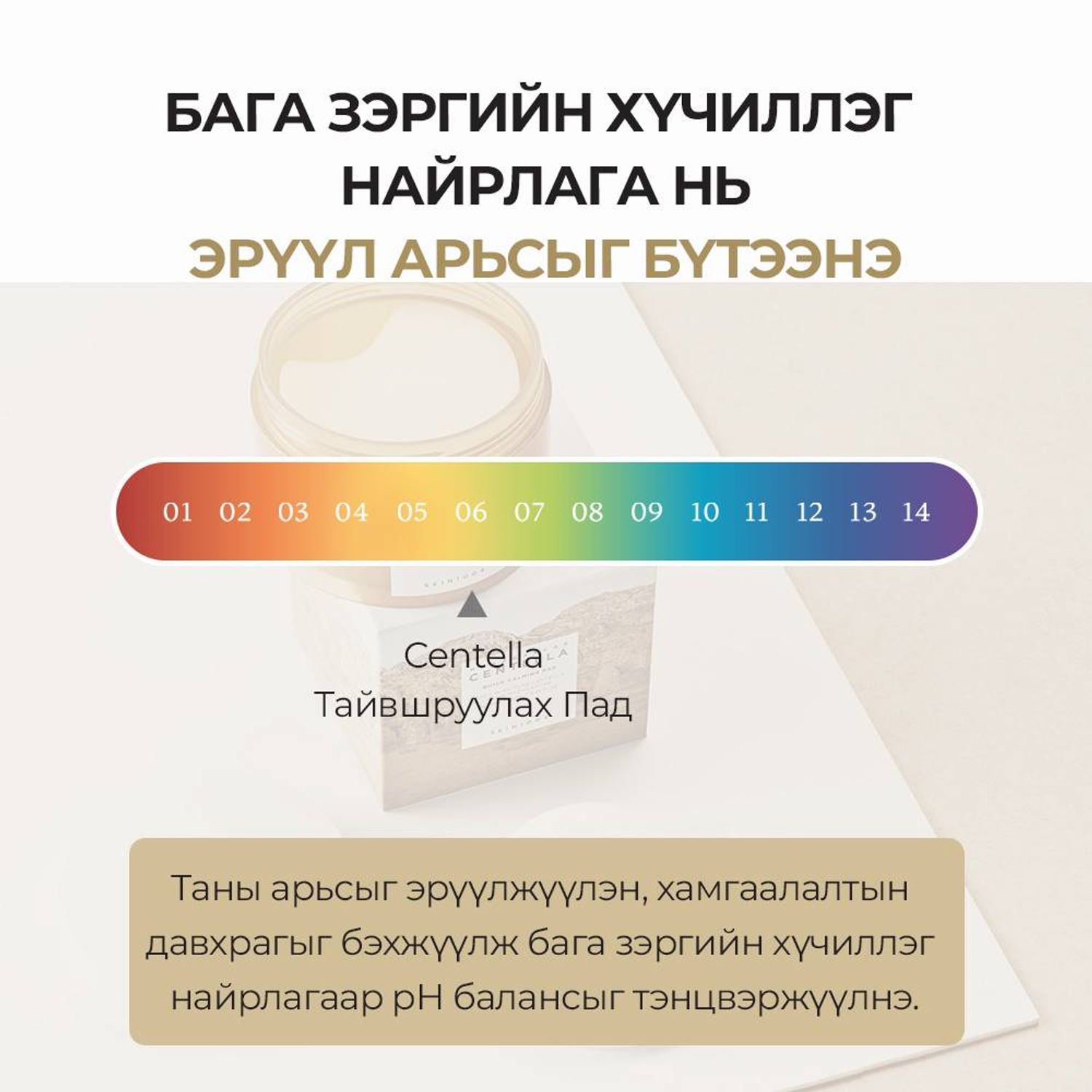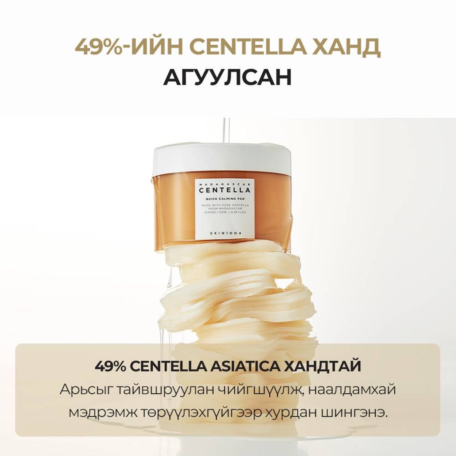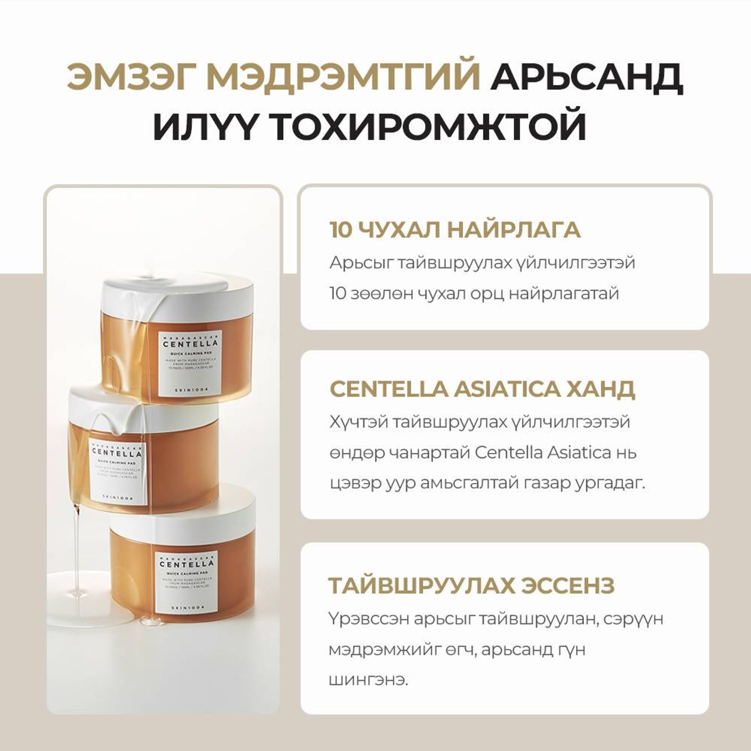 -Центелла Азитикагийн ханд болон нэн чухал 10 найрлагаас бүрдэх тул арьсыг хурдан тайвшруулж, цочролыг багасгана.