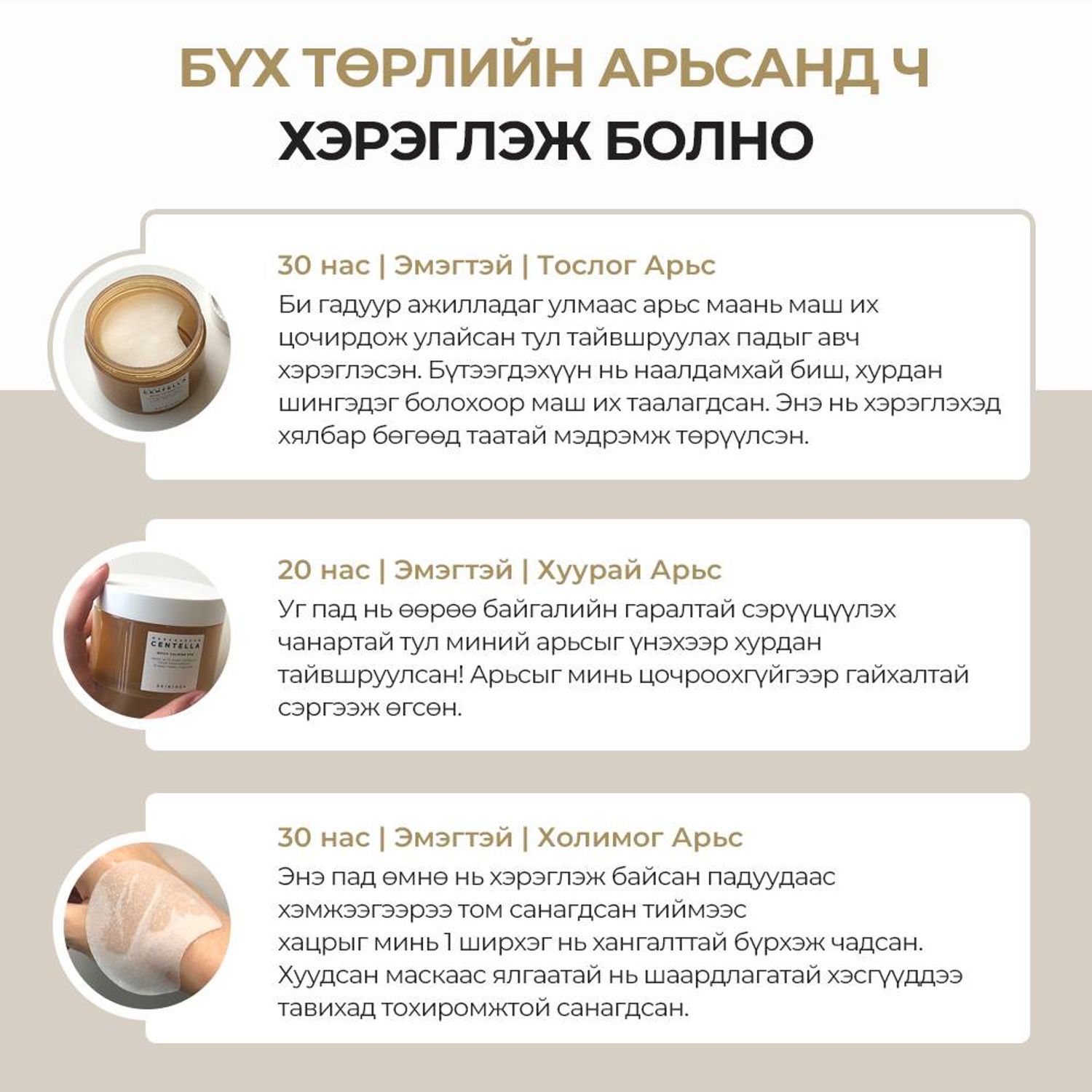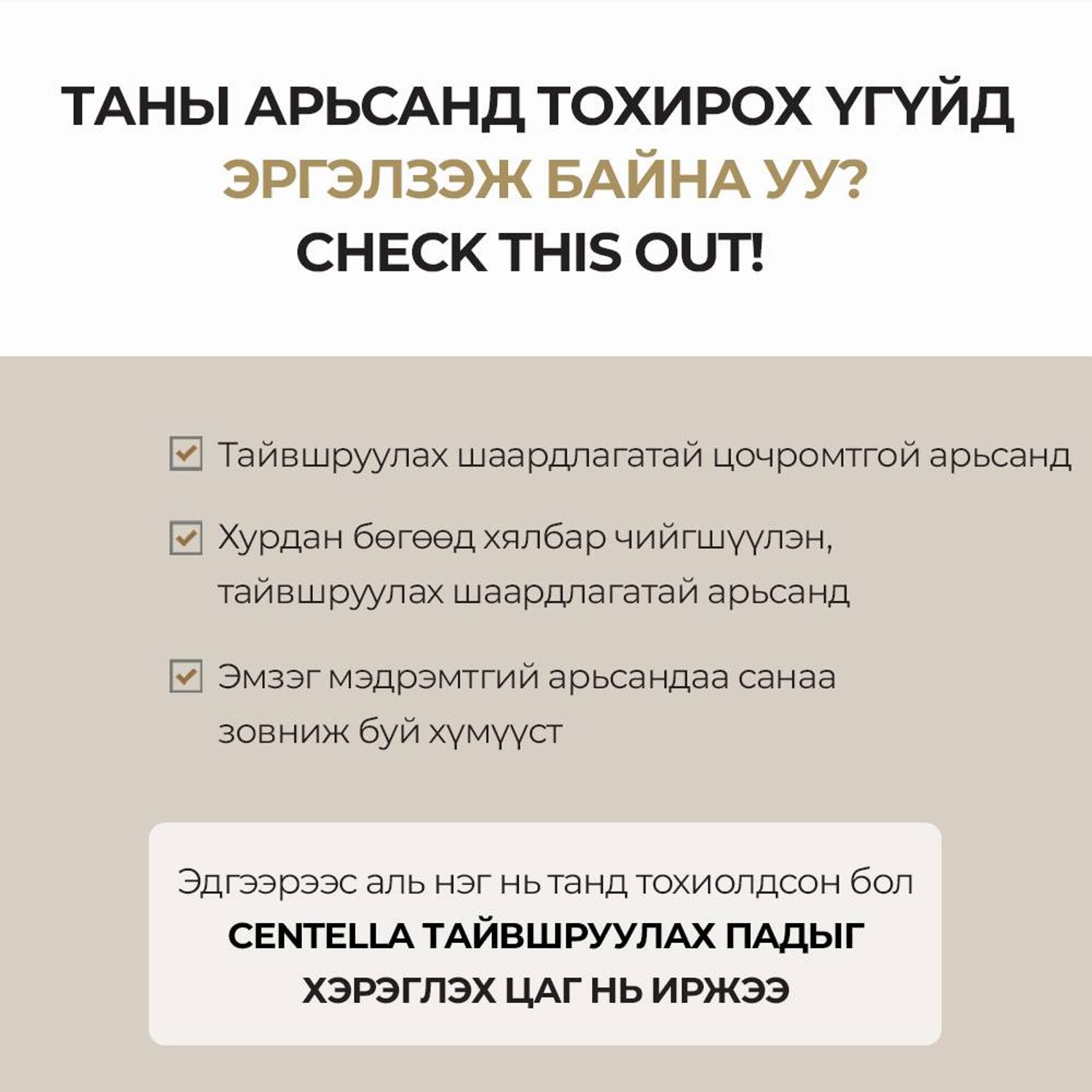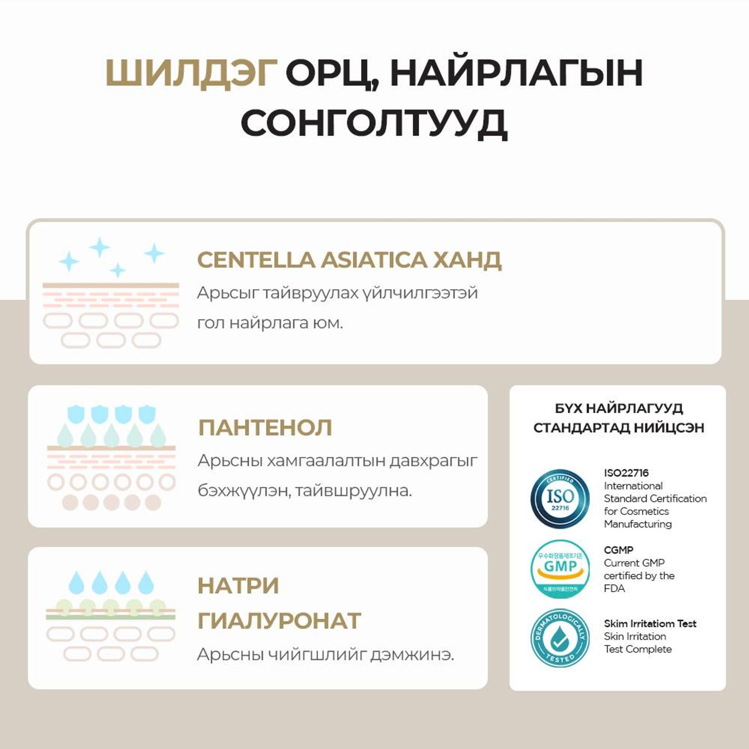 -Центелла Азитикагийн ханд болон нэн чухал 10 найрлагаас бүрдэх тул арьсыг хурдан тайвшруулж, цочролыг багасгана.