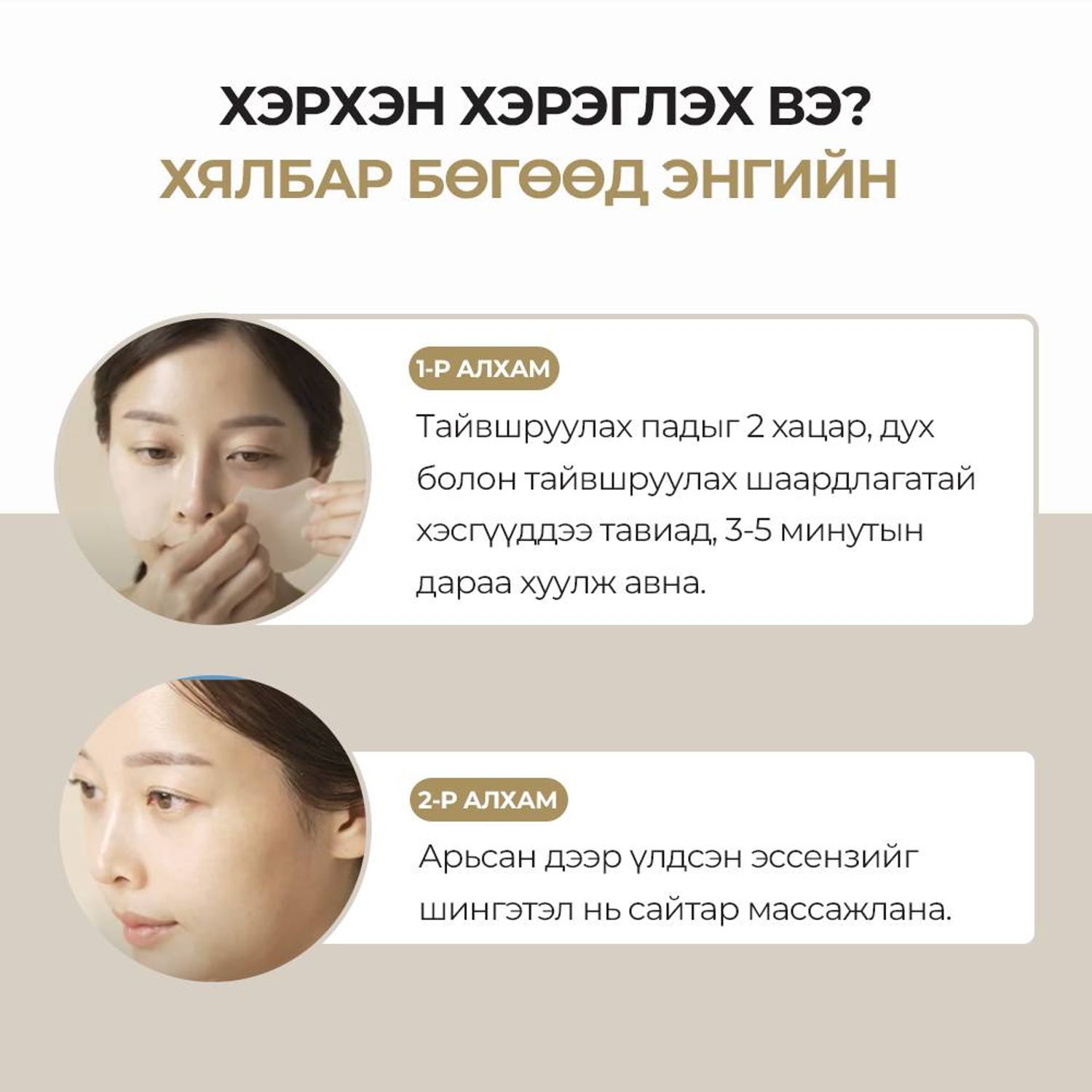 Цэвэрлэгээнй араас арьсны PH тэнцвэржүүлэх тайвшруулах зорилгоор нүүрнийхээ эмзэгшилтэй, хуурайшилттай хэсэгт 3-5 минутын хугацаатай шингээж, үлдэгдэл эссэнсийг шингээнэ.