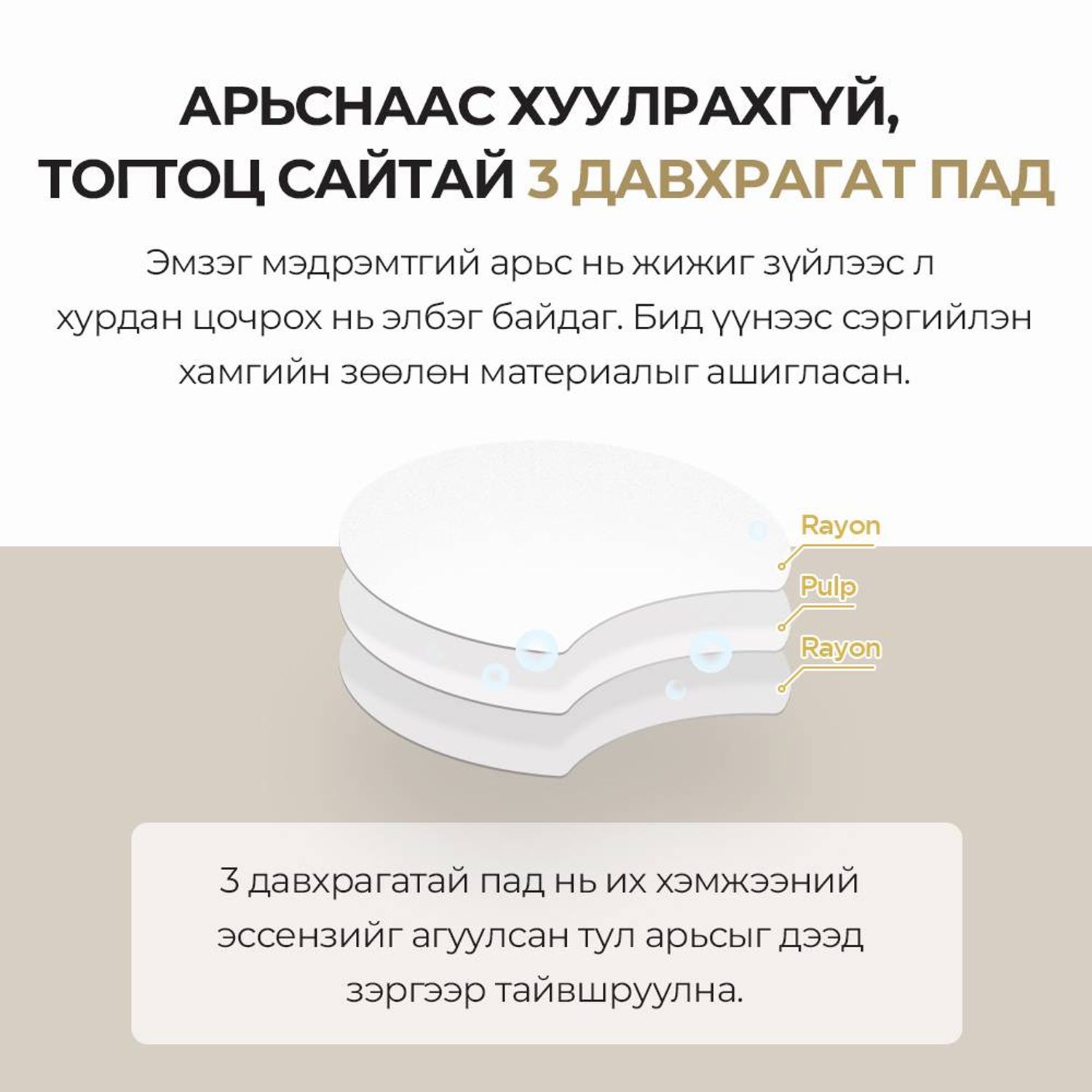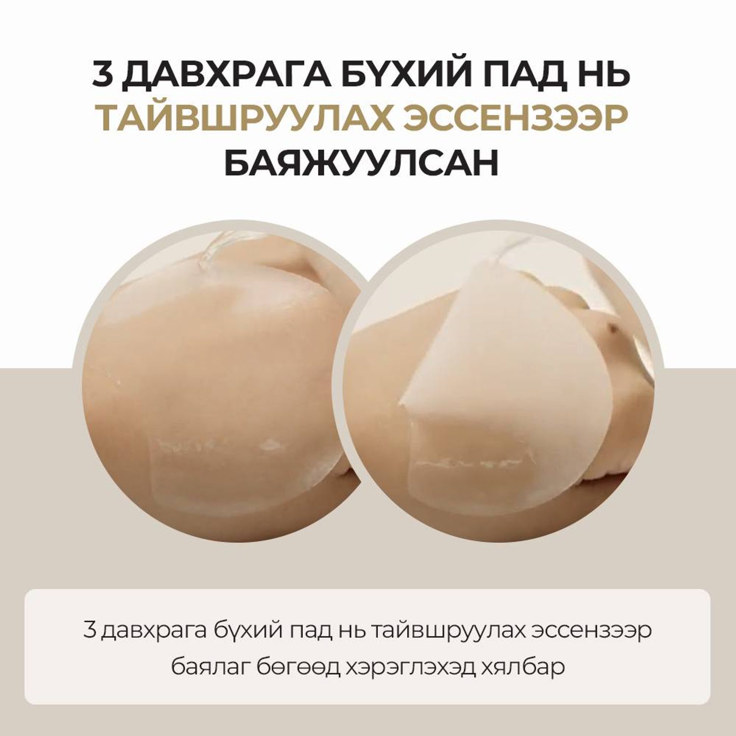 -Эссэнзээр баялаг 3 давхаргатай пад нь арьсыг гүн чийгшүүлж, тайвшруулах маск болгон ашиглах боломжтой.