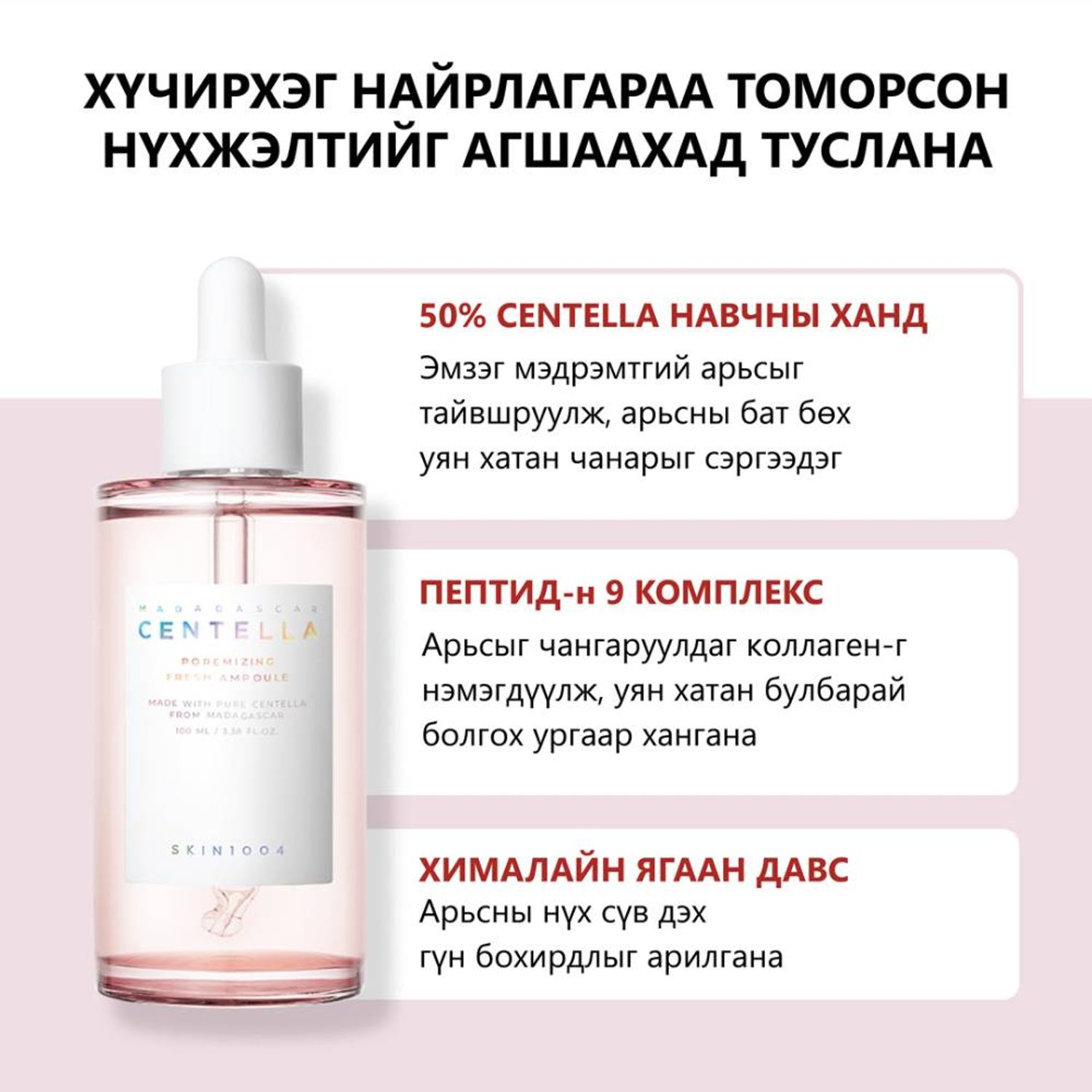 Цэвэршүүүлсэн далайн ягаан давс, 9 төрлийн пептид, каллоген болон центеллагийн төгс хослол болох энэхүү багц нь нүхжилтийн эсрэг үйлчилгээтэй. Нүх сүвэн дэх бохирдлыг гүн цэвэрлэж, нүхжилтийг агшаах гол үүрэгтэй. Арьсны тослогийн булчирхайг цочроохгүйгээр тэнцвэржүүлж, тольгор арьсыг бий болгоно. Байгалийн органик найрлагатай тул эмзэг, мэдрэмтгий арьсанд ч тохирно.
