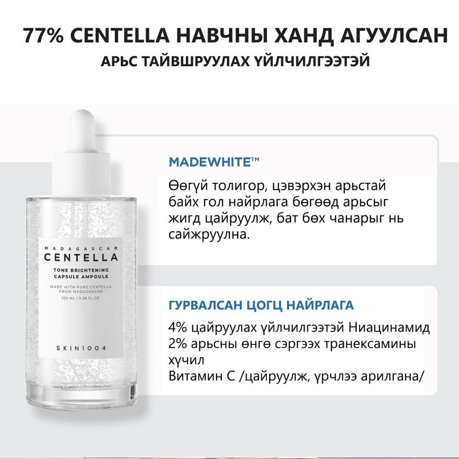 SKIN1004Тусгай патентлагдсан MADEWHITE технологиор эрчимтэй цайруулах иж бүрдэл нь найрлагандаа хамгийн трэнд болц буй 5 дахин өндөр чанартай центеллагаас гадна ниацинамид, витамин с агуулсан.