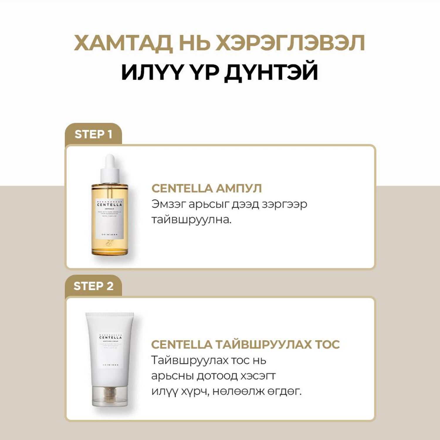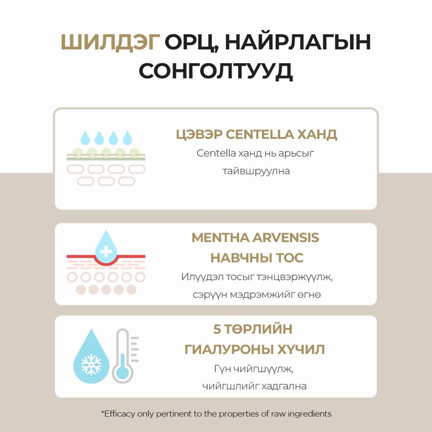 - Байгалийн эрдэнэ шишийн тос болон Центелла азиатика ургамлын хандагуулсан эмзэг арьсыг эрчимтэй чийгшүүлж тайвшруулна