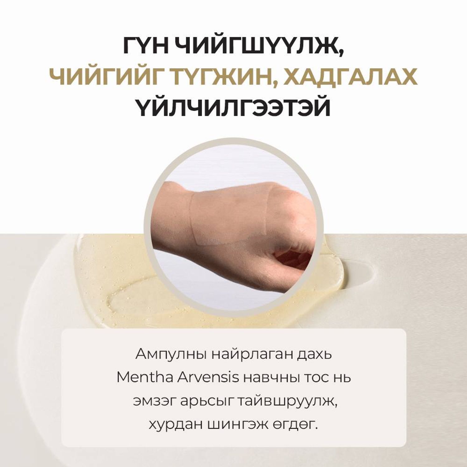 Зөвлөмж: Хэрвээ таны арьс тостой, эсвэл шингээж дуусахгүй их хэмжээний эссенс үлдвэл цэвэрхэн хөвөнөөр, тонер ашиглан зөөлөн арчиж авч болно, гэхдээ угаах нь шаардлагагүй.