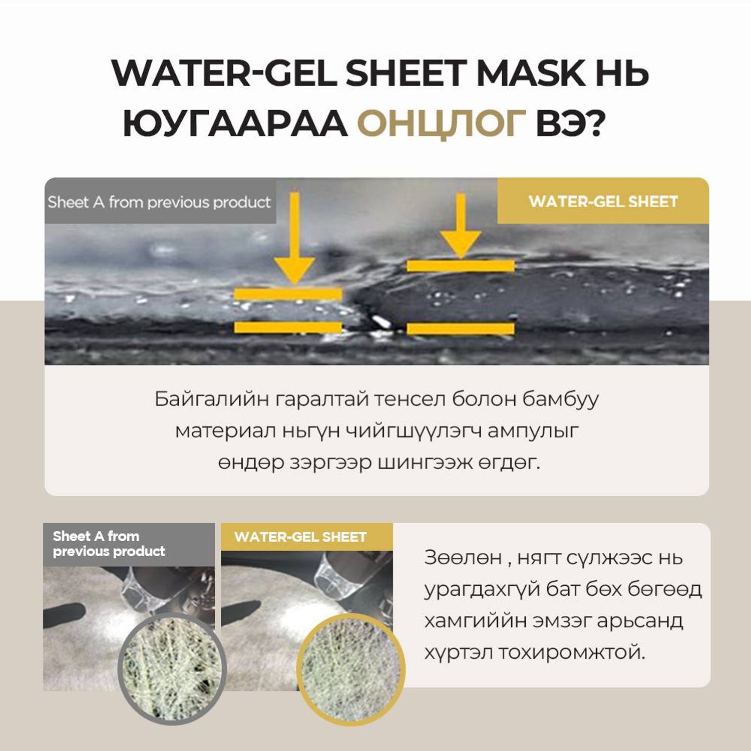 - Watergel салфеткан маскны технологи нь эссэнсийг буцаж өөртөө шингээхгүй, арьсанд 100% шингэх боломжийг олгодог буюу маскны хамгийн сүүлийн үеийн технологи юм.