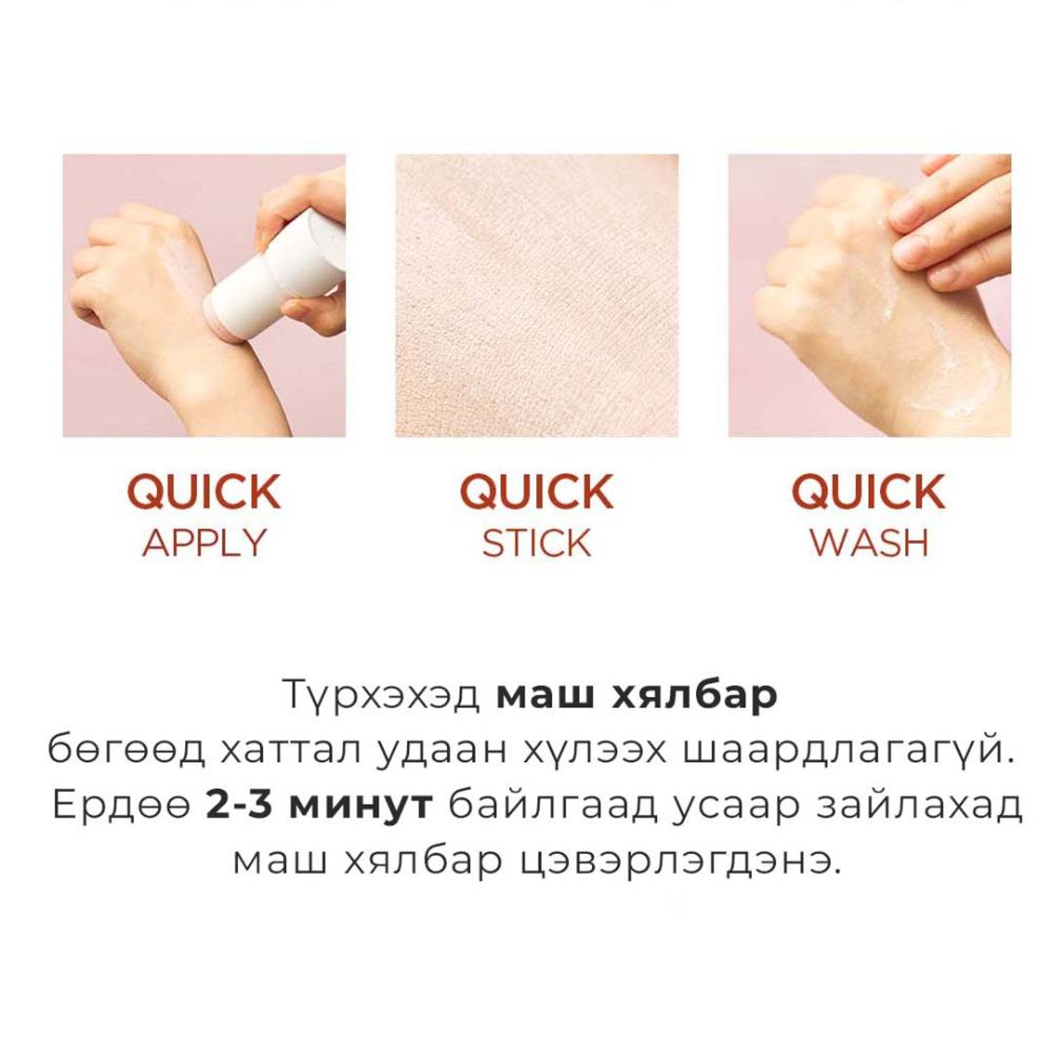 Нүд болон уруулын хэсгээс зайтай түрхэж, 3-5 минутын дараа усаар угаана. Илүү үр дүн мэдрэхийг хүсвэл 10-15 минутын дараа усаар угааж болно. Гэхдээ араас нь чийгшүүлэлт сайн хийгээрэй.