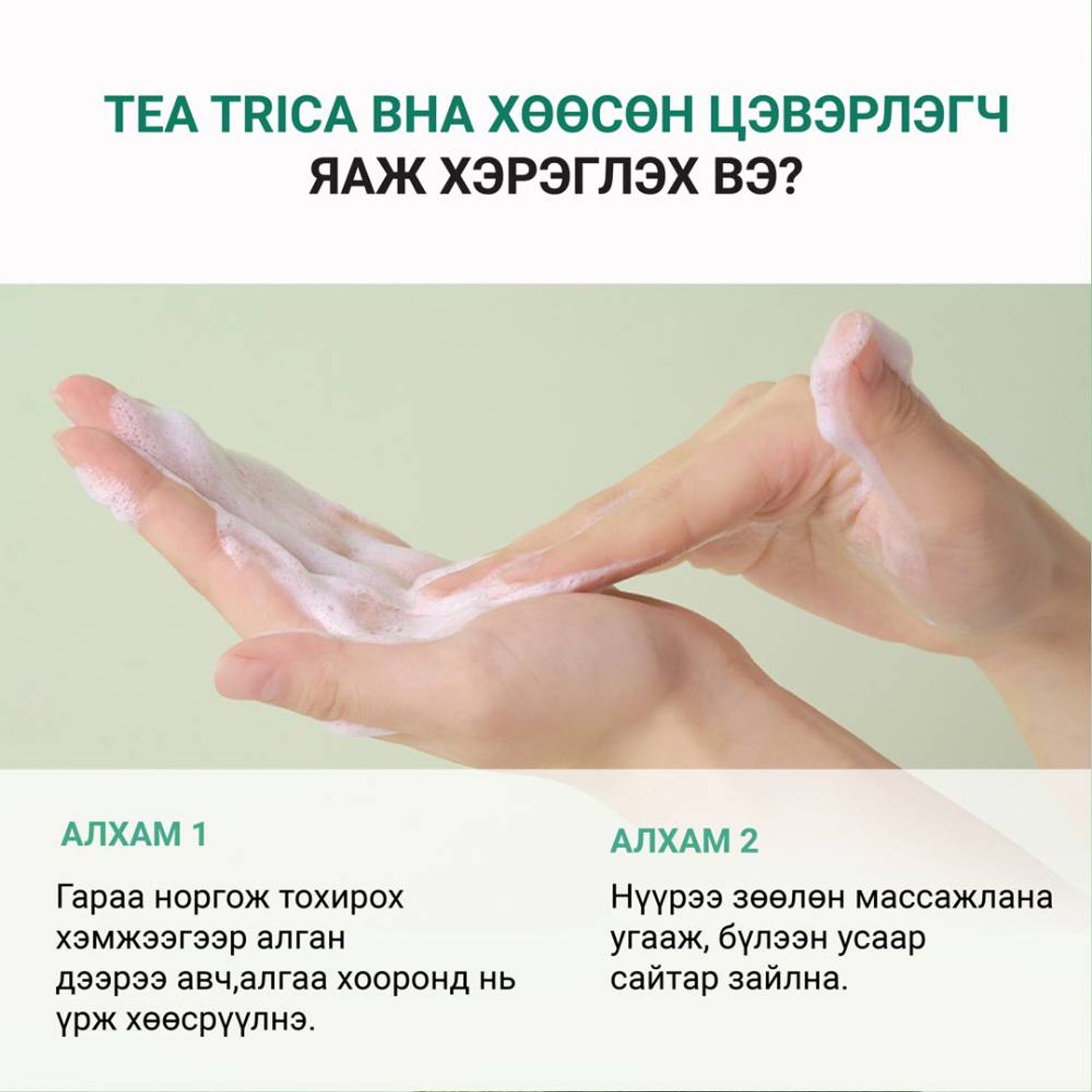 Тосон цэвэрлэгчийн араас чийглэг гаран дээрээ шахаж, өтгөн хөөс үүсгэн нүүрэндээ зөөлөн массажлан угаасны дараа бүлээн усаар угаана.