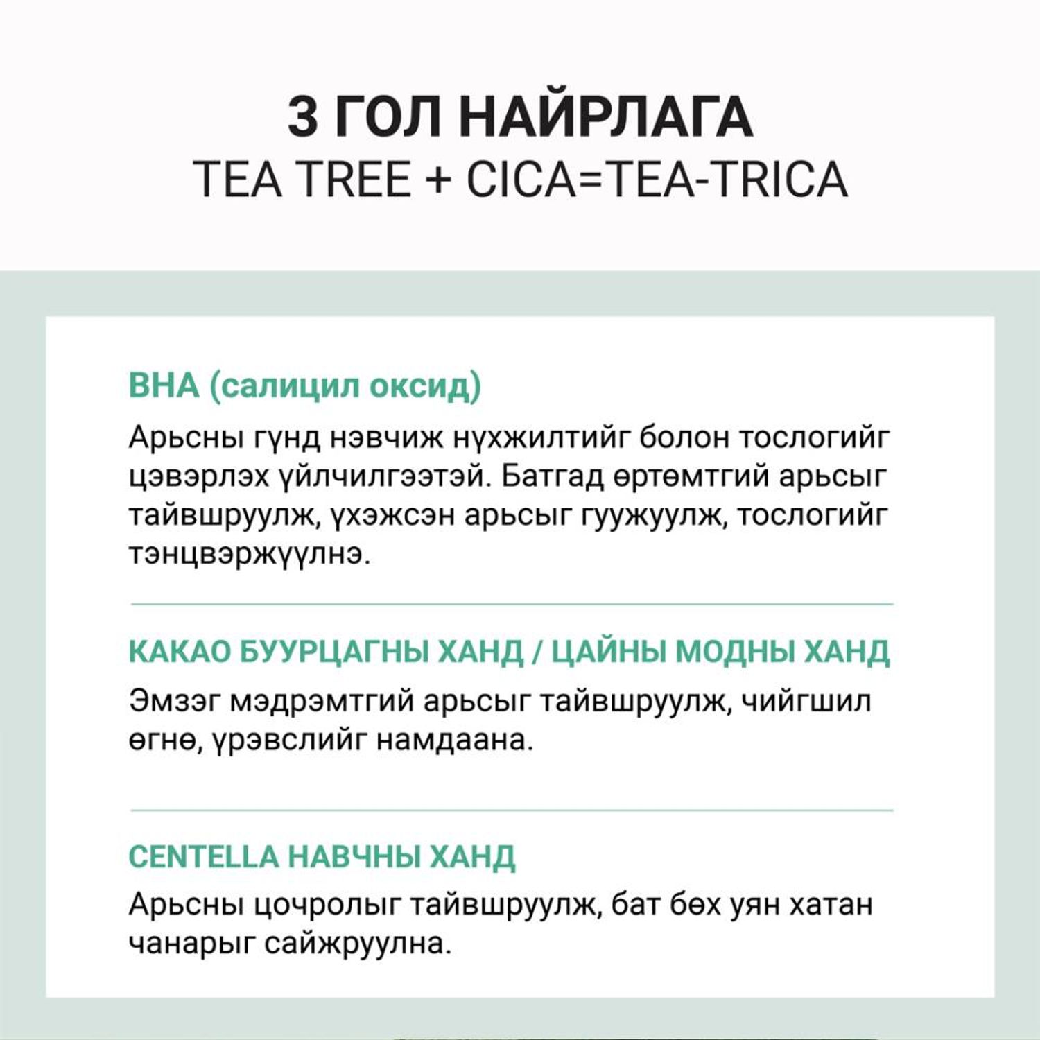 - Арьсыг зөөлөн цэвэрлэхийн тулд цайны модны үнэртэй бүтэц нь өтгөн хөөс үүсгэдэг.